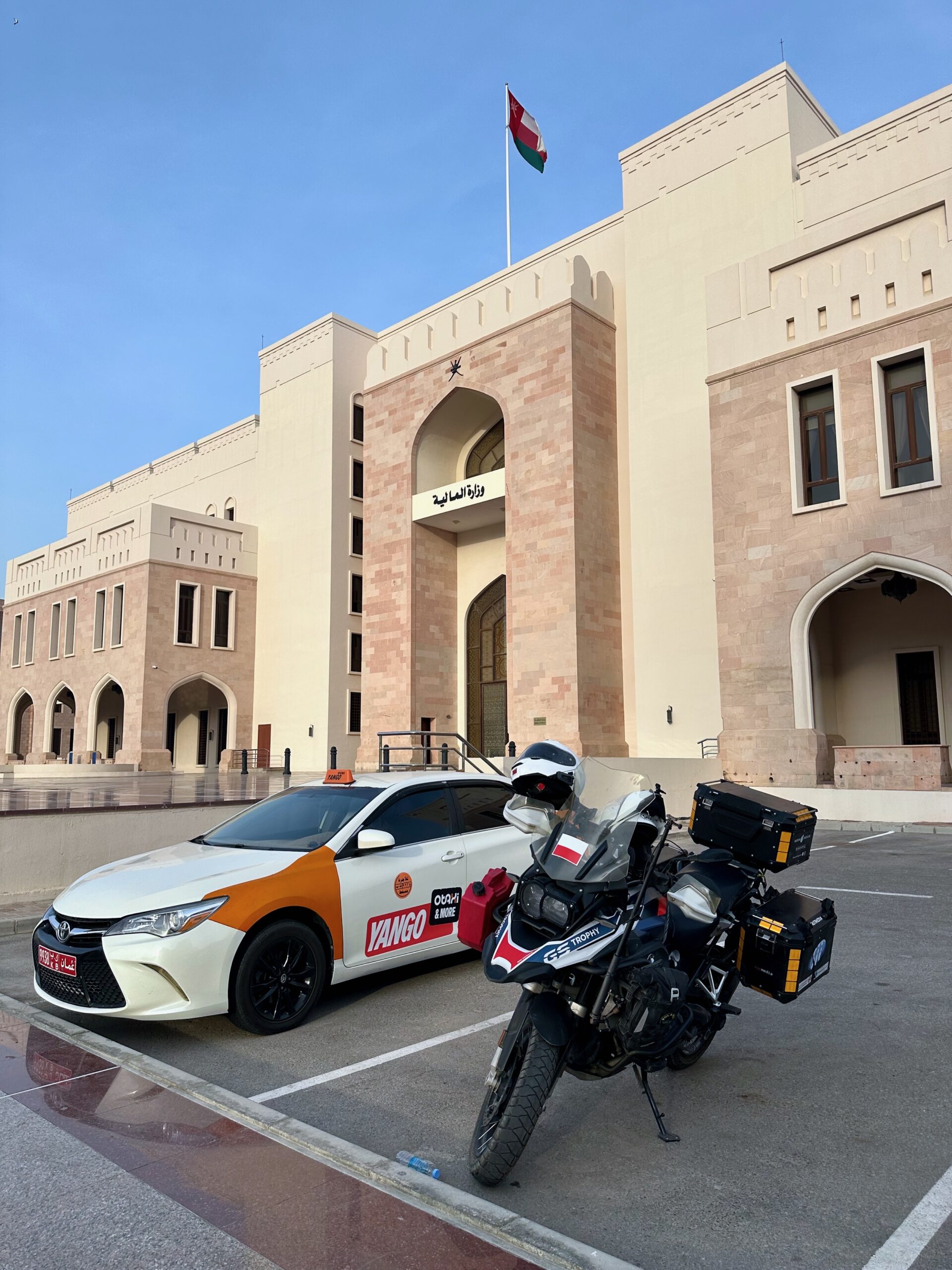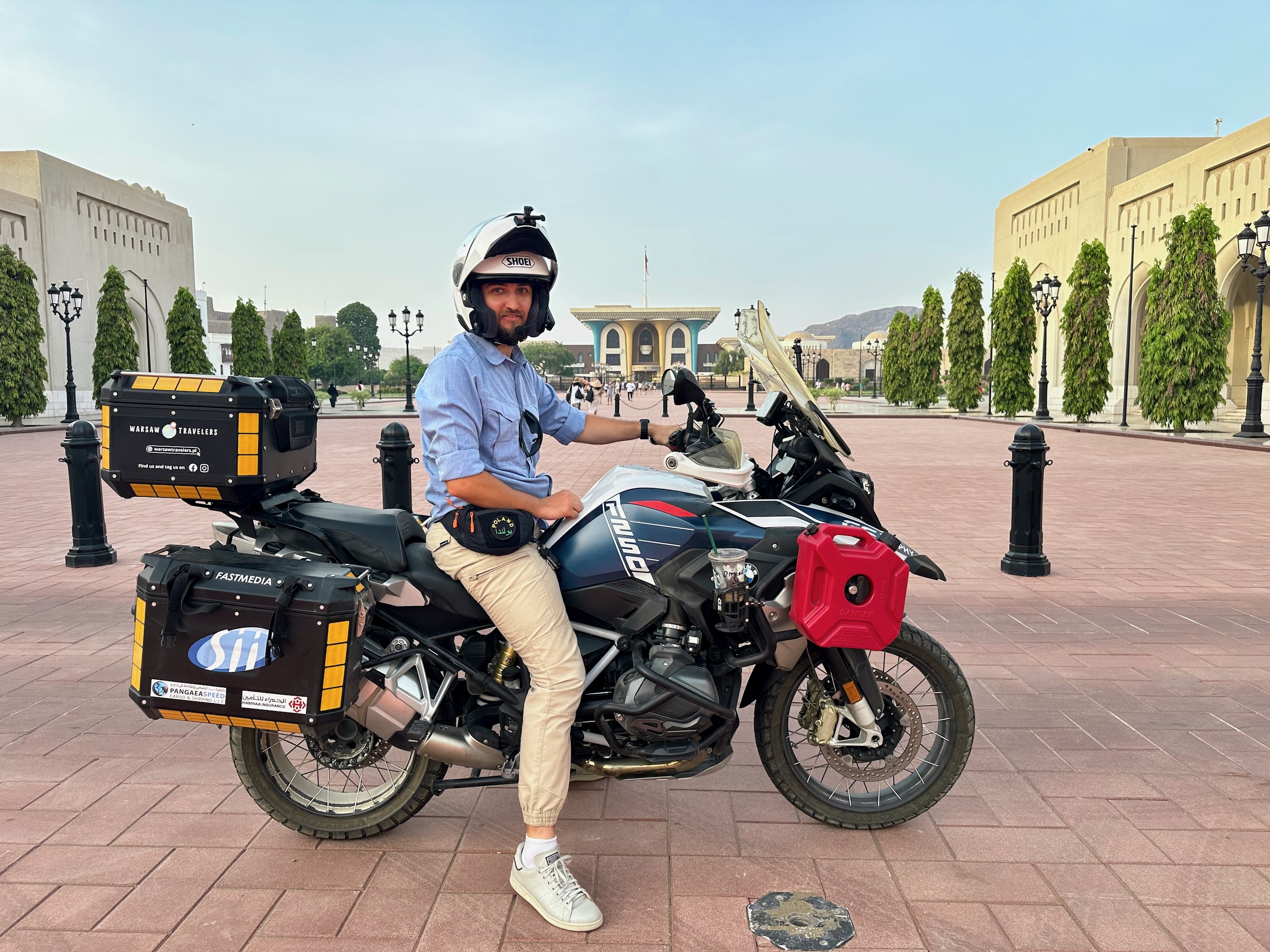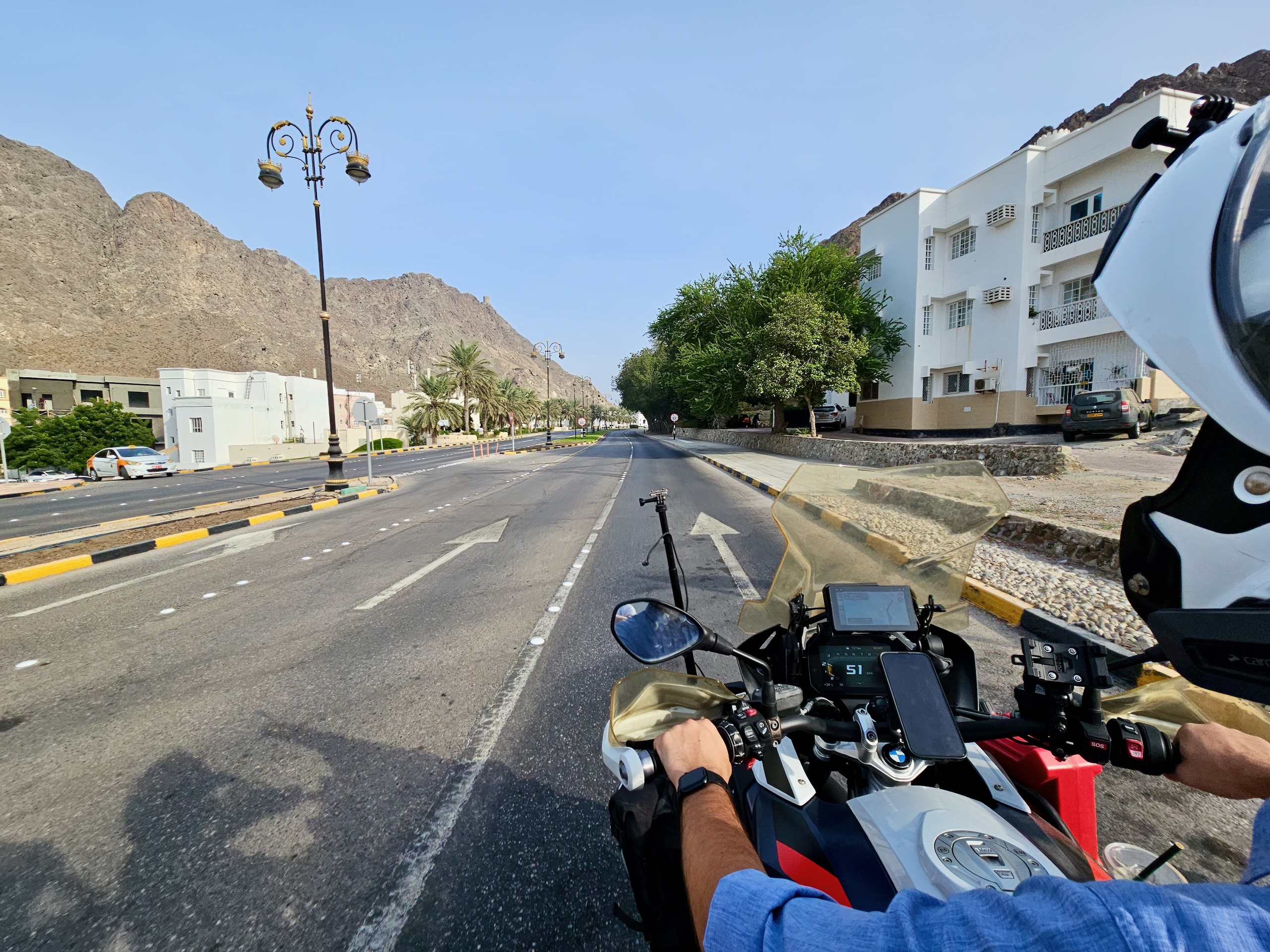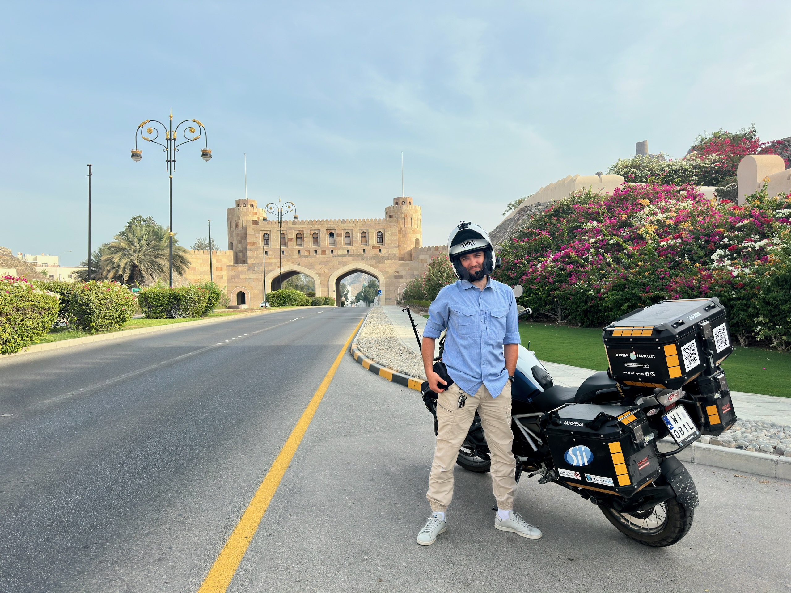 Jeśli chodzi o jazdę w mieście, bywało nawet zabawnie. Ktoś próbował nam tłumaczyć, że kierowcy nie zawsze zwracają uwagę na motocyklistów… i w głowie od razu mieliśmy Rijad. W Arabii ludzie też potrafią być mili, ale na drogach czasem wygląda to jak sport ekstremalny. W Muscacie nie mieliśmy poczucia, że ktoś „poluje” na nas na pasie — choć standard jak wszędzie zostaje aktualny: większy odstęp, przewidywanie manewrów, zero wiary w kierunkowskazy.