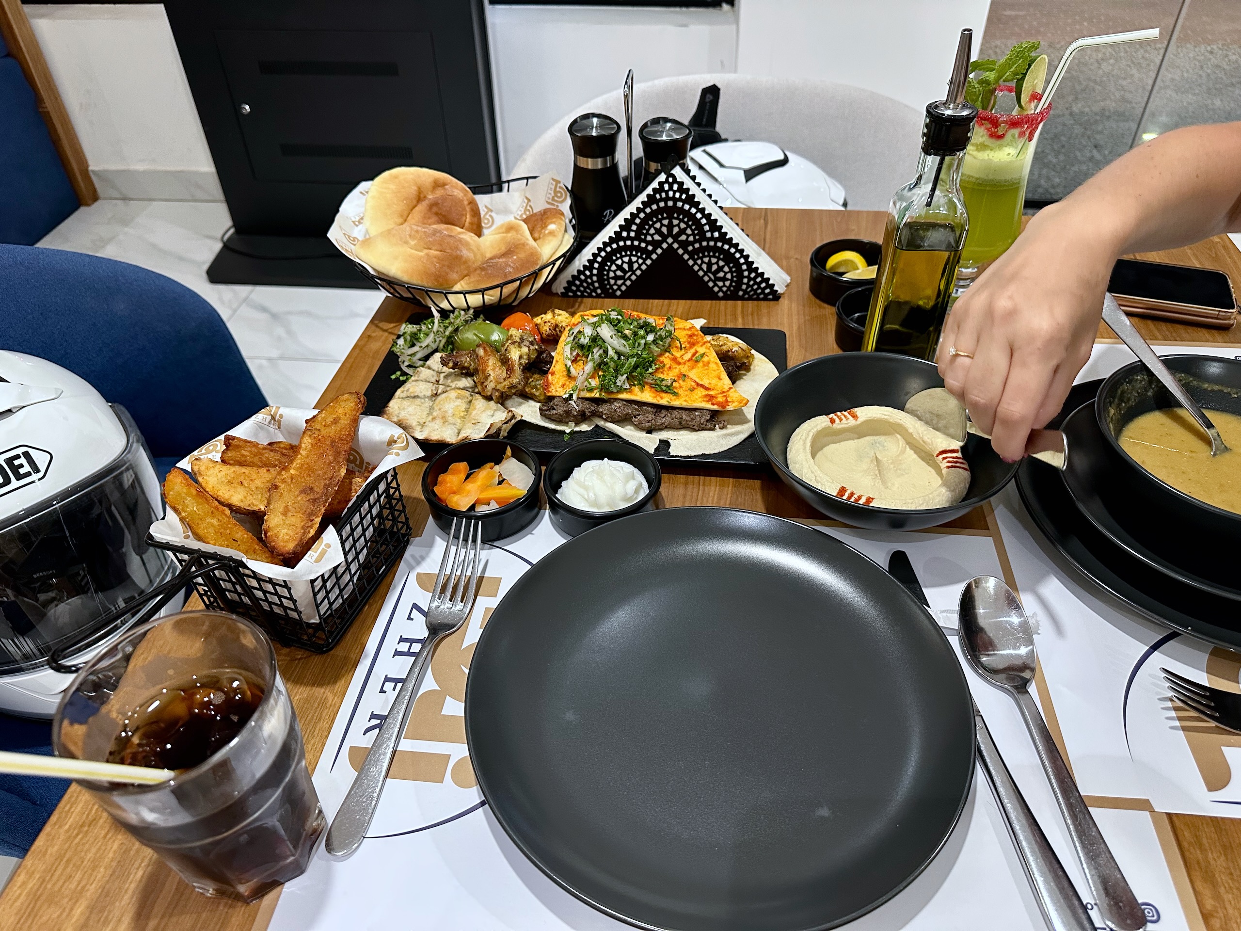 Jedzenie w Muscacie ogarnialiśmy raczej „po lokalnemu”, bez polowania na fine dining. Najczęściej kończyło się na klasykach typu shawarma i różnych wersjach mięs z grilla, bo przy takim trybie dnia liczy się jedno: ma być szybko, smacznie i bez zbędnych ceregieli.