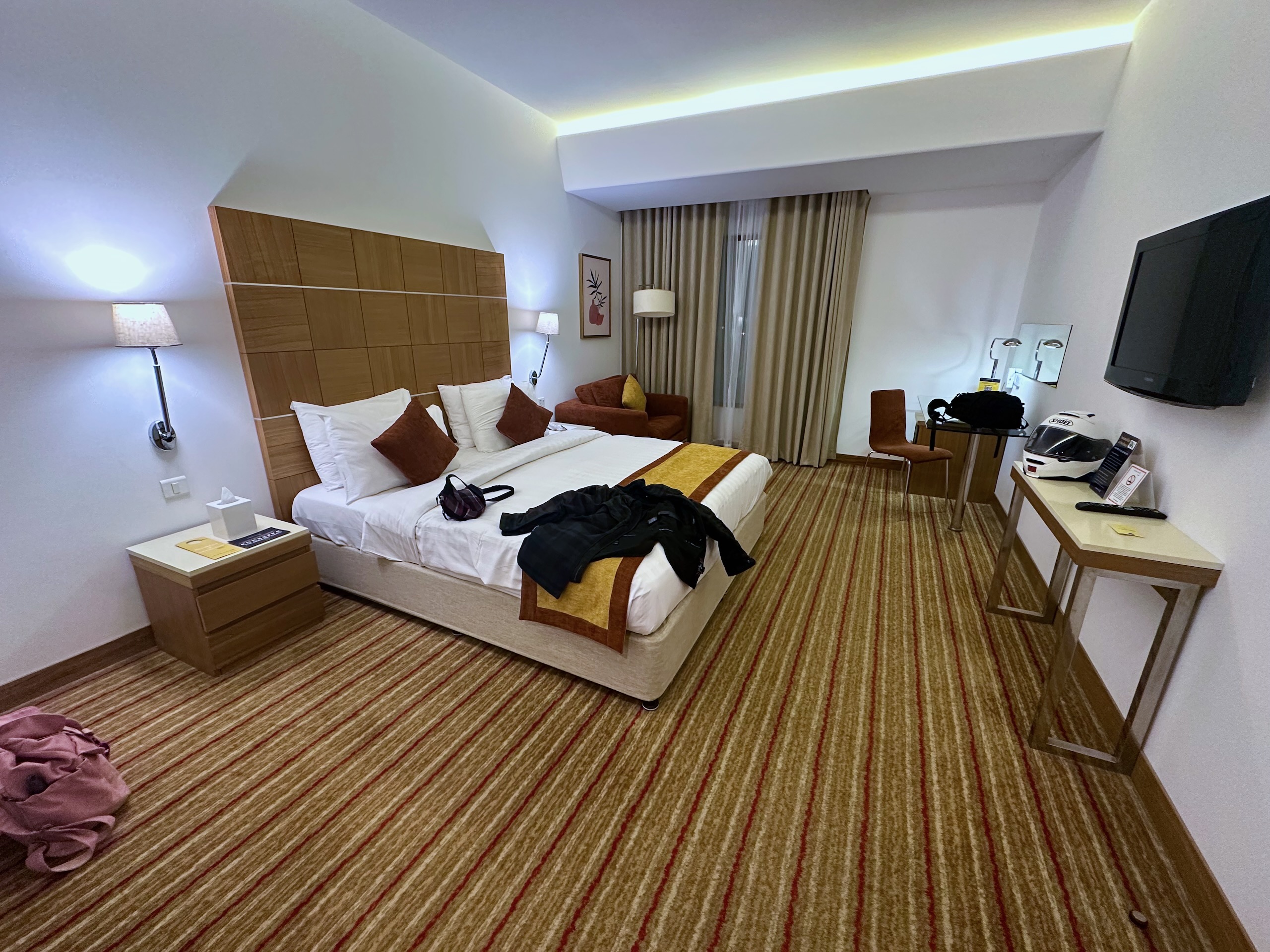 W Muscacie zatrzymaliśmy się w Golden Tulip Muscat i po tych kilku dniach możemy spokojnie powiedzieć, że to była bardzo sensowna baza wypadowa. Za 5 nocy ze śniadaniem zapłaciliśmy 1213 zł, a rezerwację robiliśmy mniej więcej półtora miesiąca wcześniej. Jak na standard hotelu i realia stolicy w tej części świata, cena wyszła nam naprawdę spoko.