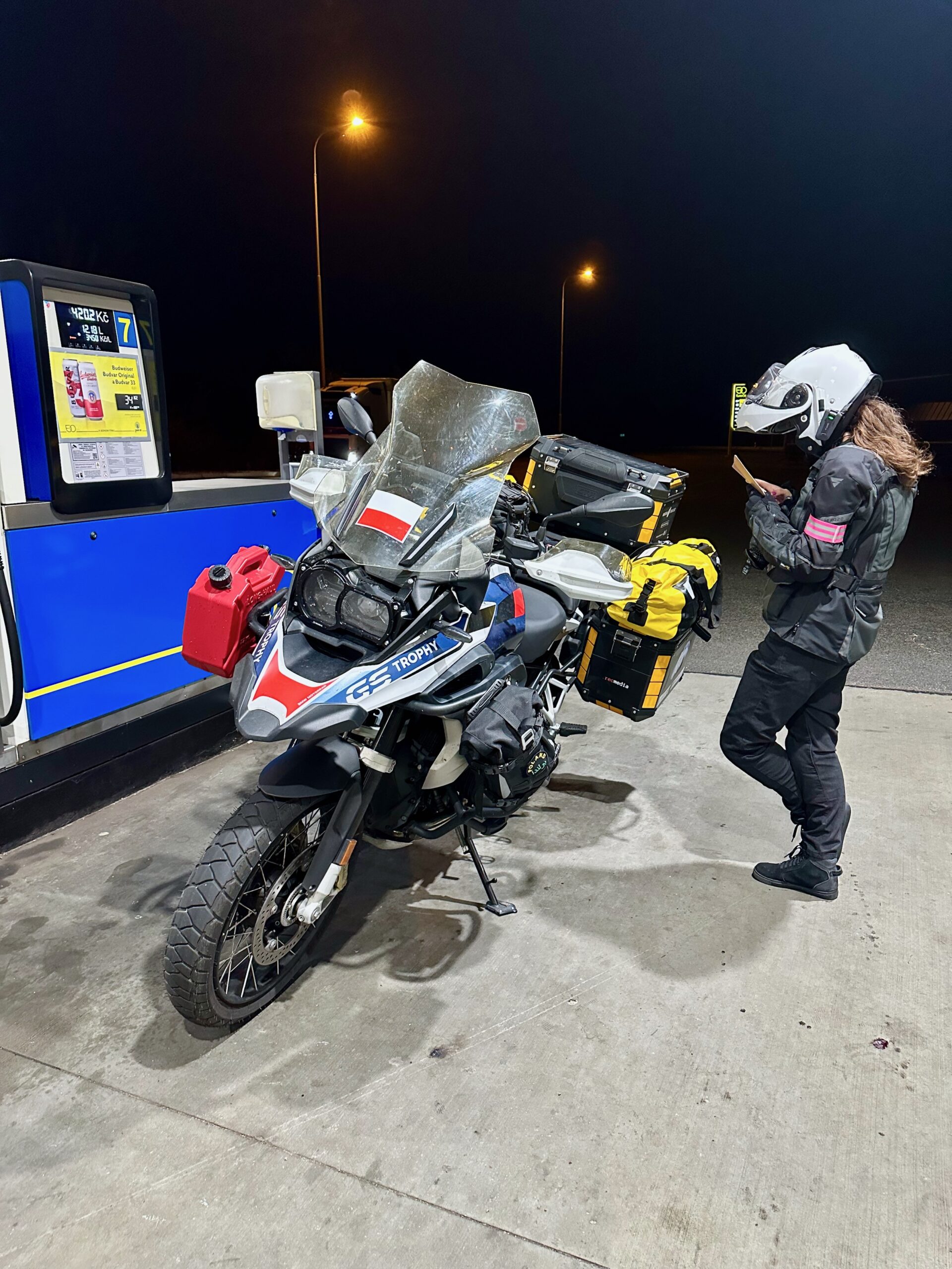 Piątek, dzień wyjazdu, łączyliśmy jeszcze z pracą zdalną — błąd. Taki dzień powinien być tylko na ogar i pakowanie, a nie na „jeszcze wyślę dwa maile”. Do tego szybki wypad do galerii, żeby wymienić dolary na Irak, bo nie wiedzieliśmy, czego się spodziewać po tamtejszych kantorach. Schodzenie z tobołami na parking, pierwsze przymiarki i… tankbag okazał się królem przeszkadzaczy. Telefon nie siadał jak trzeba, pulpit kierowcy ledwo widoczny, a czasu coraz mniej. Wyjazd opóźniony o jakieś 30 minut (celowaliśmy w 16:30). Trudno — ogarniemy to „później” (ta, jasne xD). Rura, jedziemy!