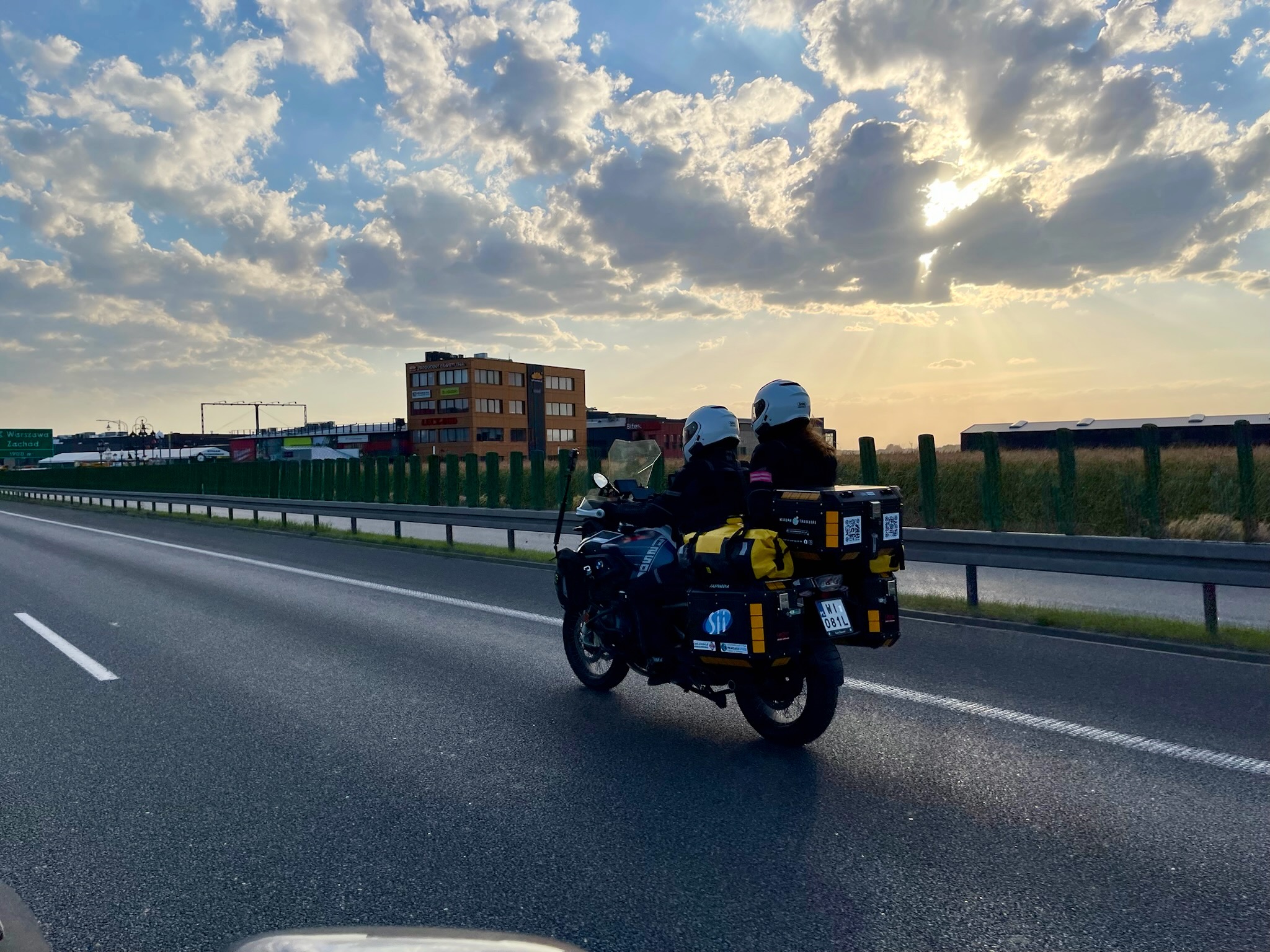 Oczywiście po jakimś czasie jazdy spotkał nas nierozłączny przyjaciel – deszcz. Bo przecież nie może być piękna pogoda, prawda? Etap europejski to jeden wielki prysznic. Było ciepło, więc wkładanie przeciwdeszczowych ubrań to udręka. Trzeba się zatrzymać, wygrzebać to z kufra, wciągnąć na siebie… dramat. Na buty Jadzia miała jeszcze jakiś sensowny ochraniacz, ale ja? Zostawiłem swoje buty przeciwdeszczowe w Warszawie z myślą: „no przecież nic się nie wydarzy”. Ta… nic. Do gry wjechały worki na śmieci i co? Idealny patent. Śmieszne? A działa.