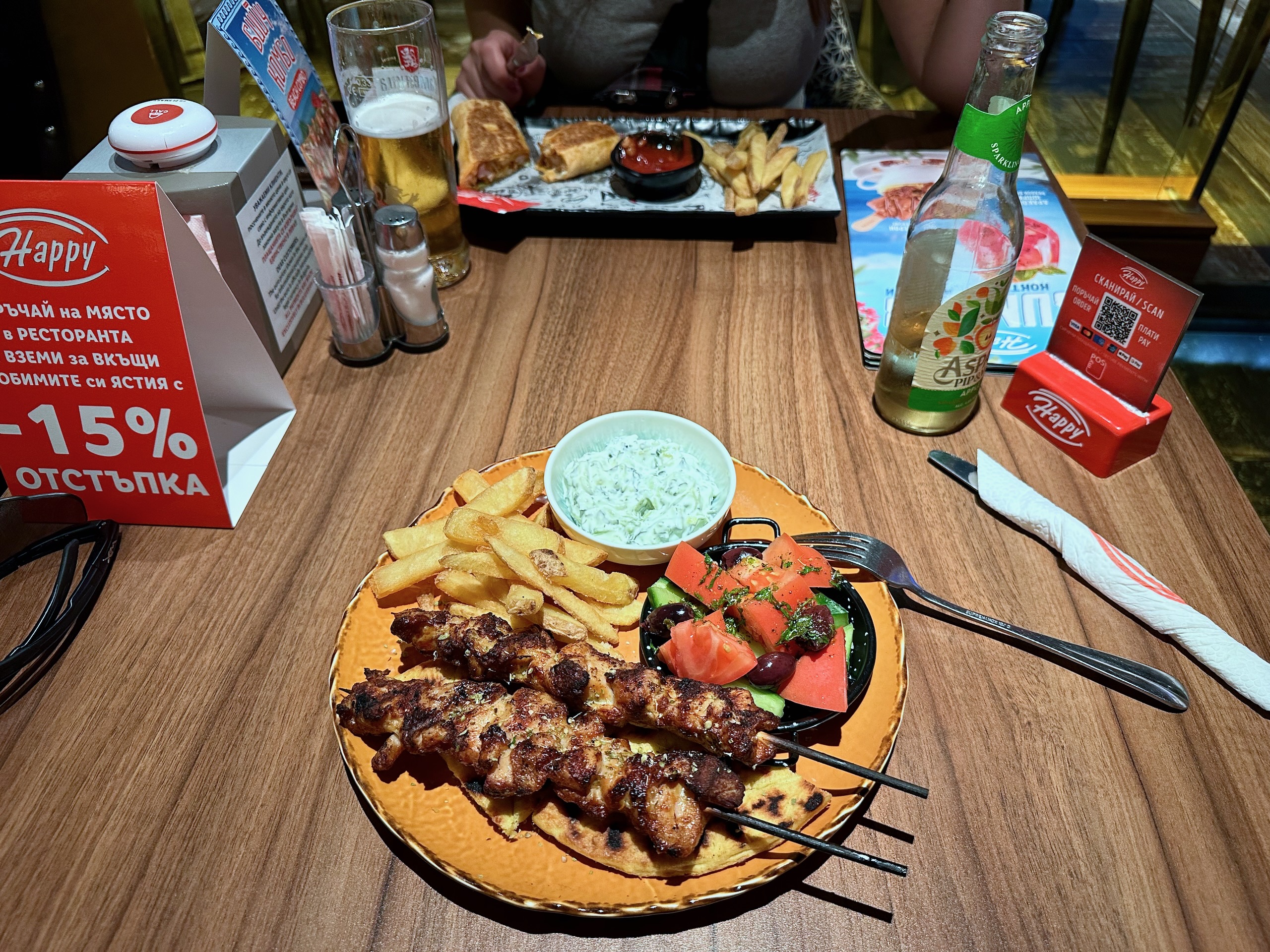 Trasa spokojna, granica szybka, tylko trochę więcej aut w kolejce. Nocleg tym razem w Sofii, a tam powitał nas różowy pokój — Jadzia od razu szczęśliwsza 😄 Pakowanie szło nam już lepiej — nie zabieraliśmy wszystkiego jak leci. Więcej rzeczy przerzuciliśmy do rollbagów (czyli rolowanych toreb na kufry, które mamy z tyłu motocykla). Wyskoczyliśmy jeszcze na krótki spacer w okolicy hotelu, potem obiadokolacja w pobliskiej knajpce, zgranie kart z kamer i szybki zakup na Allegro — dwie karty eSIM do Turcji, żeby mieć internet od razu po wjeździe do kraju. Siusiu, paciorek i spać.