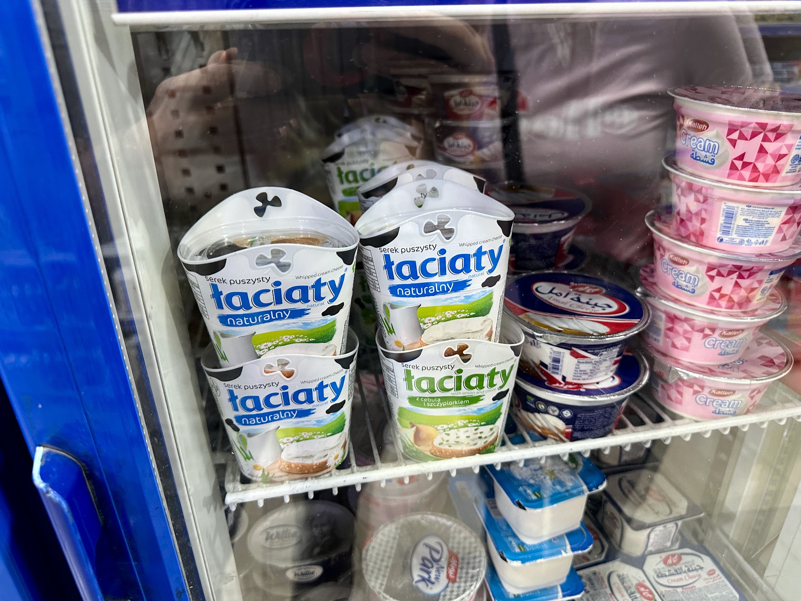 Pod hotelem zaparkowaliśmy pod okiem ochrony. Panowie pilnowali nie tylko obiektu, ale i naszego motocykla, więc nie czuliśmy się w ogóle zagrożeni. Dziś odpuściliśmy zwiedzanie miasta wieczorem. Zamówiliśmy jedzenie przez Talabat (shawarma, bo czymże innym, skoro cały miesiąc to nasz podstawowy pokarm haha), a w pobliskim sklepie spożywczym trafiliśmy na polskie produkty. Widok serka „Łaciaty” w Bagdadzie trochę nas rozbroił. 😅