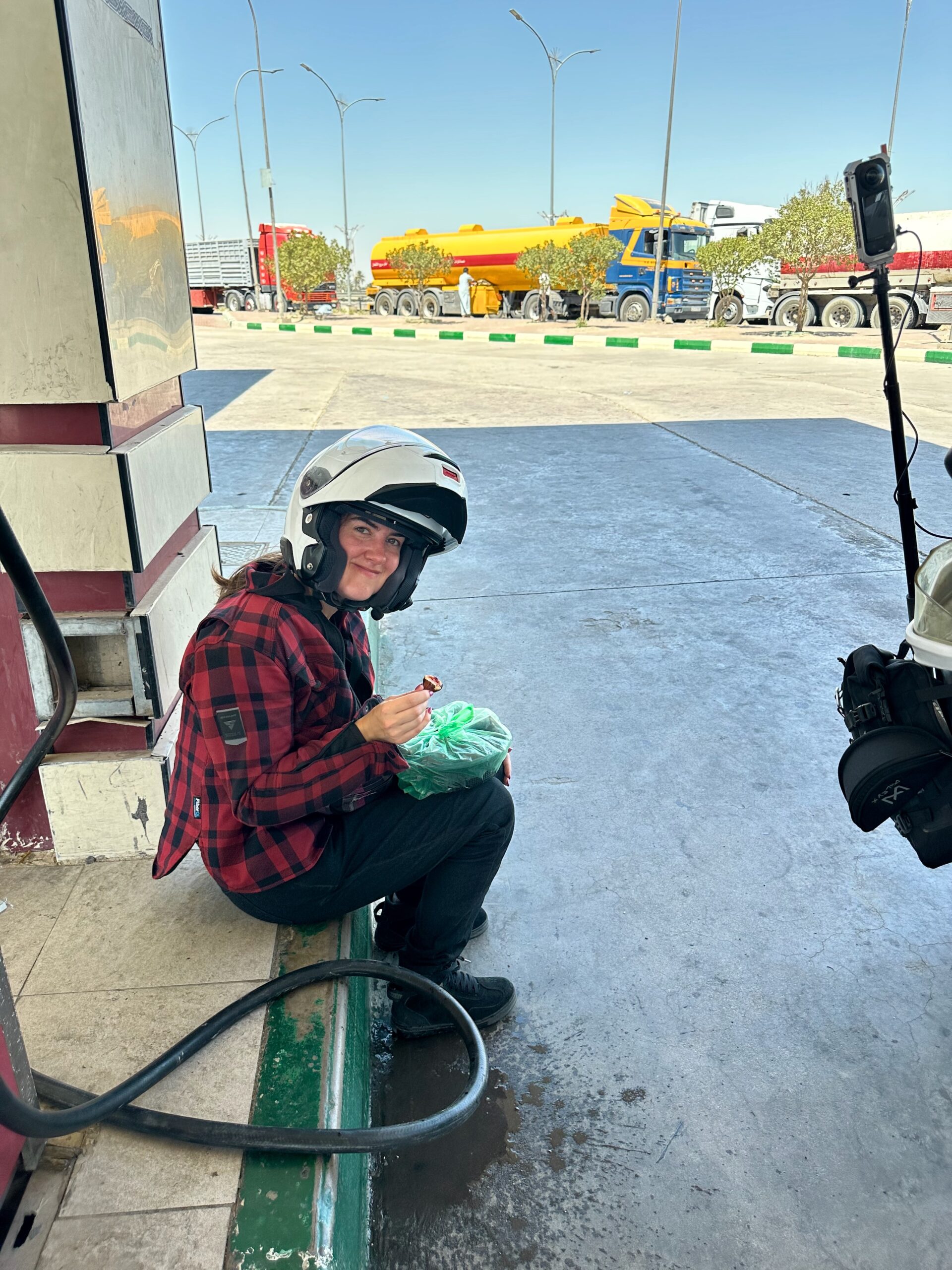 Na stacji, gdzie czekaliśmy na cysternę z paliwem, ktoś przyniósł nam michę świeżych fig – nie jedną, całą michę 😂. Fajne, tylko co z tym zrobić na motocyklu? Ja takich rzeczy nie jadam, więc Jadzia dostała komplet prezentu. Zjadła tyle, ile się dało, a resztę „przepchnęliśmy” dalej – wytłumaczyliśmy sąsiadom z innego samochodu na migi, że to prezent „od nas”, i miska zaczęła krążyć między autami xD.