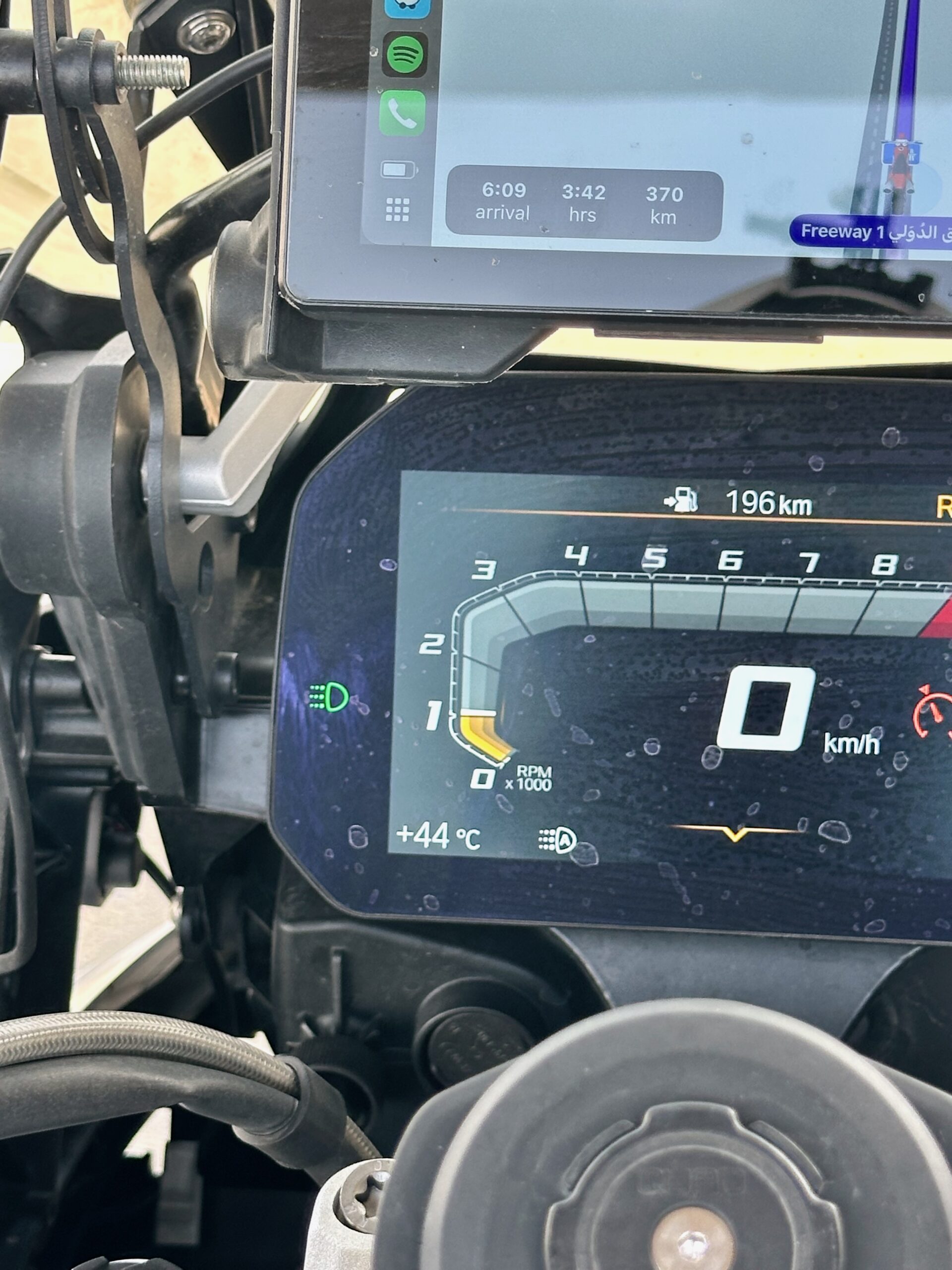 Wyjazd przed południem to był strzał w kolano. Słońce prażyło jak z pieca: 43–45°C na termometrze, w kasku pewnie bliżej 50. Kilometry nawigacja liczyła jak na złość powoli, a my topiliśmy się w meshowych ciuchach. Po obu stronach drogi ciągnęły się hałdy śmieci — ogromne, ciągłe pasy plastiku, bez dłuższej przerwy aż do setek kilometrów przed granicą z Kuwejtem. Ludzie w kraju cudownie życzliwi, ale ten śmietnikowy krajobraz daje po głowie.