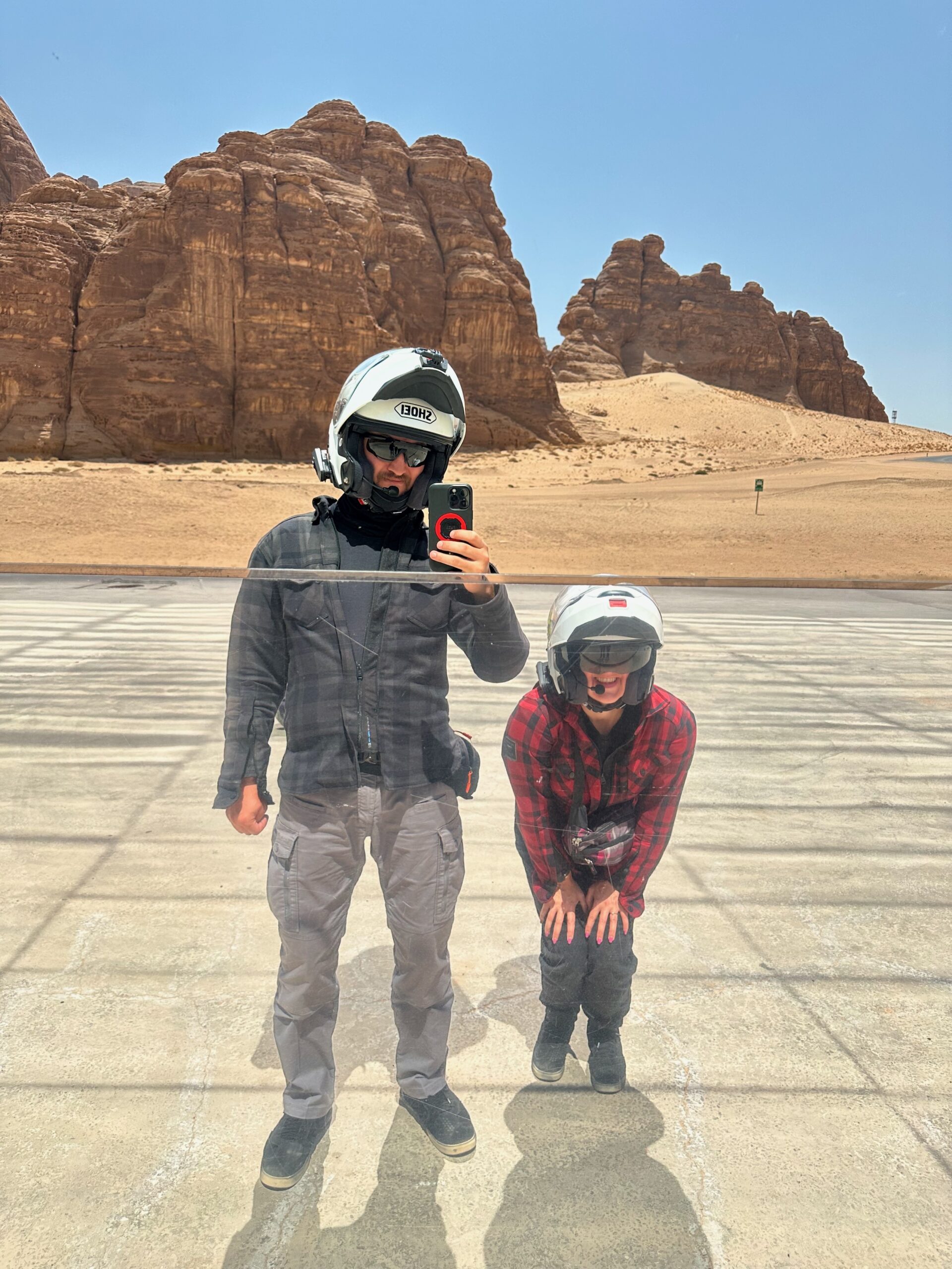 Wyjazd z Ha’il bez historii — szybkie pakowanie i w drogę. Po drodze 30 minut przerwy na kawę w Starbucksie w Buraidzie; obsługa dopytywała: „Z Polski? Motocyklem? Szacun”. No także tak 😅.