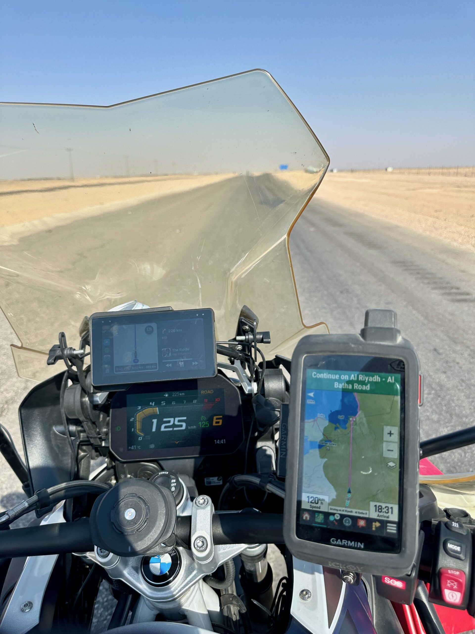Odcinek do Hail to kreska na mapie. Znaki, ciężarówki i wiatr w kasku — nuda w wersji autostradowej. Najpierw muzyka, potem już tylko szum i cisza. Kawa wypita, więc toczymy się dalej. Jeszcze przed wjazdem do KSA kupiliśmy eSIM u jednego sprzedawcy, ale telefon podpiął się do sieci Zain, który na naszych trasach miał bardzo słabe pokrycie. Często ledwo 2G, LTE/5G trafiało się rzadko. Miałem w planie wpaść na służbowego calla „po drodze”, ale przy 2G nawet MS Teams by się nie połączył. Nie było zasięgu, żeby wysłać SMS-a, więc ratowałem się Garminem – poszedł satelitarny tekst z wyjaśnieniem do kolegi z pracy 😃. Po powrocie do polski otrzymał ode mnie drobny napój procentowy.