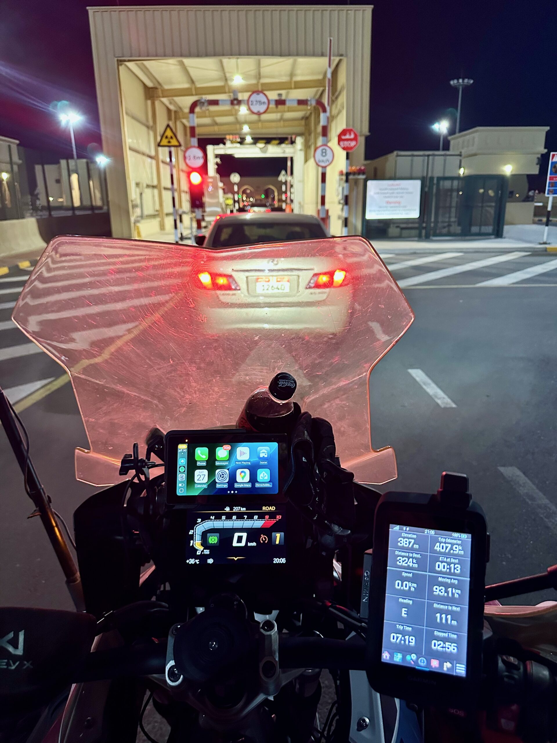 Emiraty. Tu niby wszystko działa jak w zegarku… do momentu. Funkcjonariusz patrzy w dowód rejestracyjny i mówi, że „przeterminowany”. No jasne. Chwila tłumaczenia, co jest czym w polskim dokumencie, wszystko się prostuje, dostajemy stemple i w drogę. Po drodze skan rentgenem, formalność, jedziemy dalej.