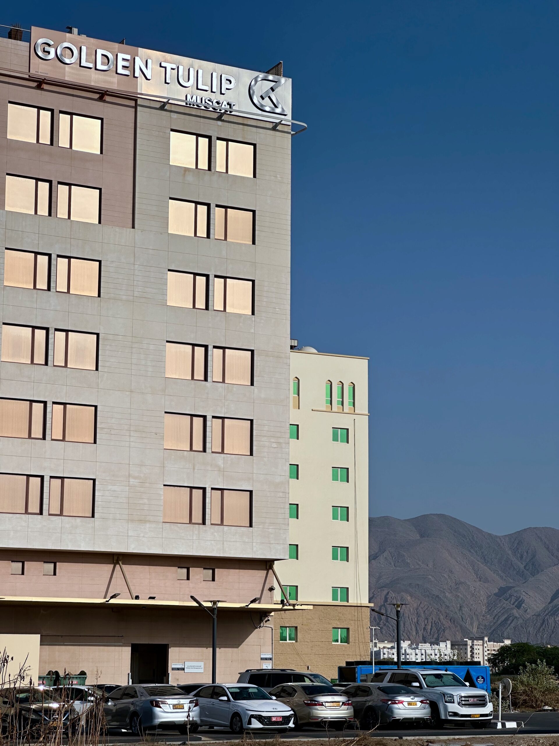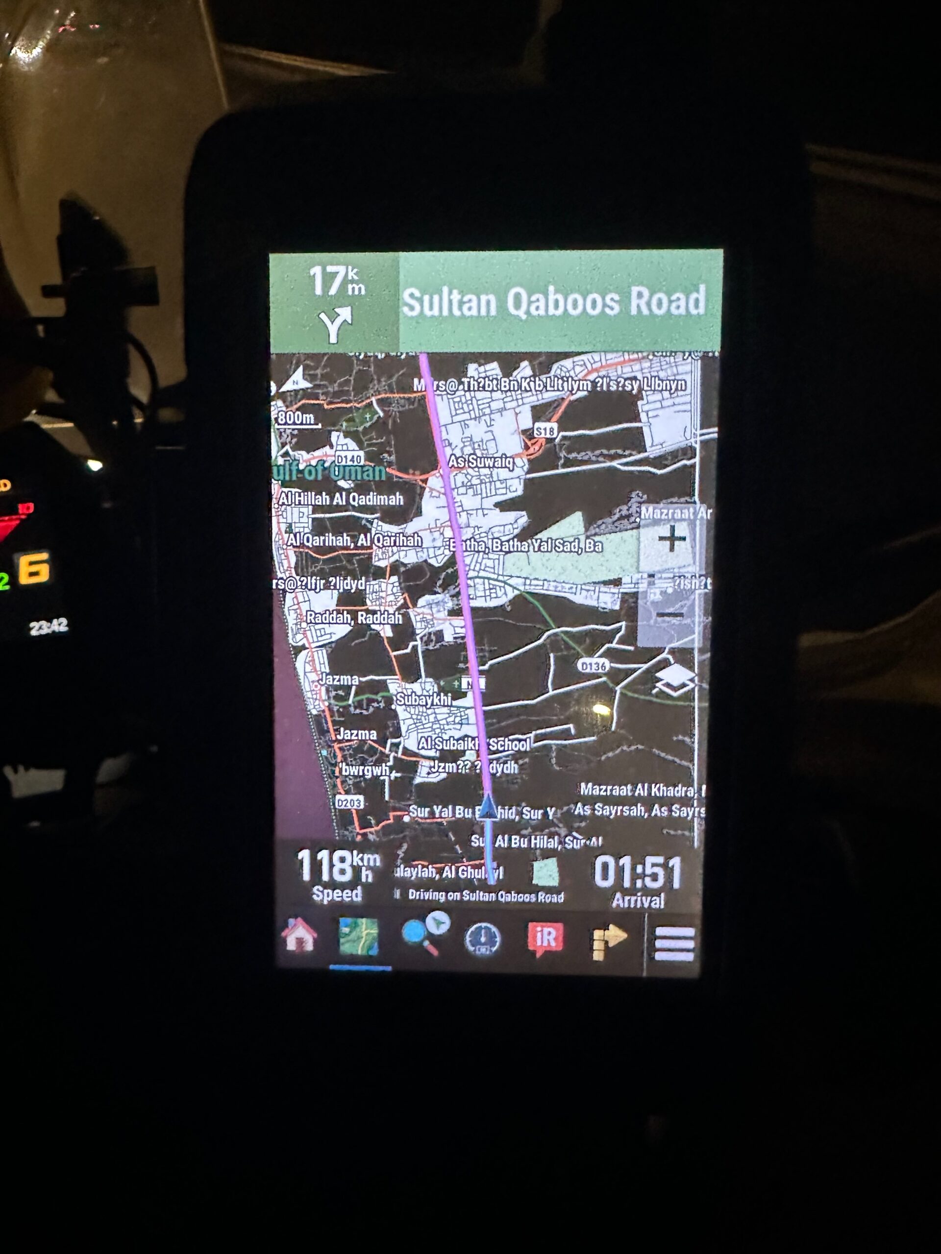 Do hotelu w Muscat dobijamy o 2:30 w nocy. Najdłuższa przeprawa tej wyprawy — na moto łącznie 12 godzin. Padliśmy jak ścięci. Łóżko mega wygodne, aż nie chciało się rano wstawać. I bonus: wilgotność. Temperatura niby niższa, ale powietrze jak mokry ręcznik — ciuchy mokre od potu i wilgoci. Dobranoc.