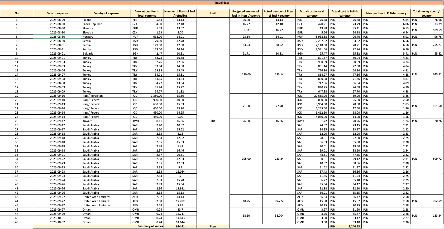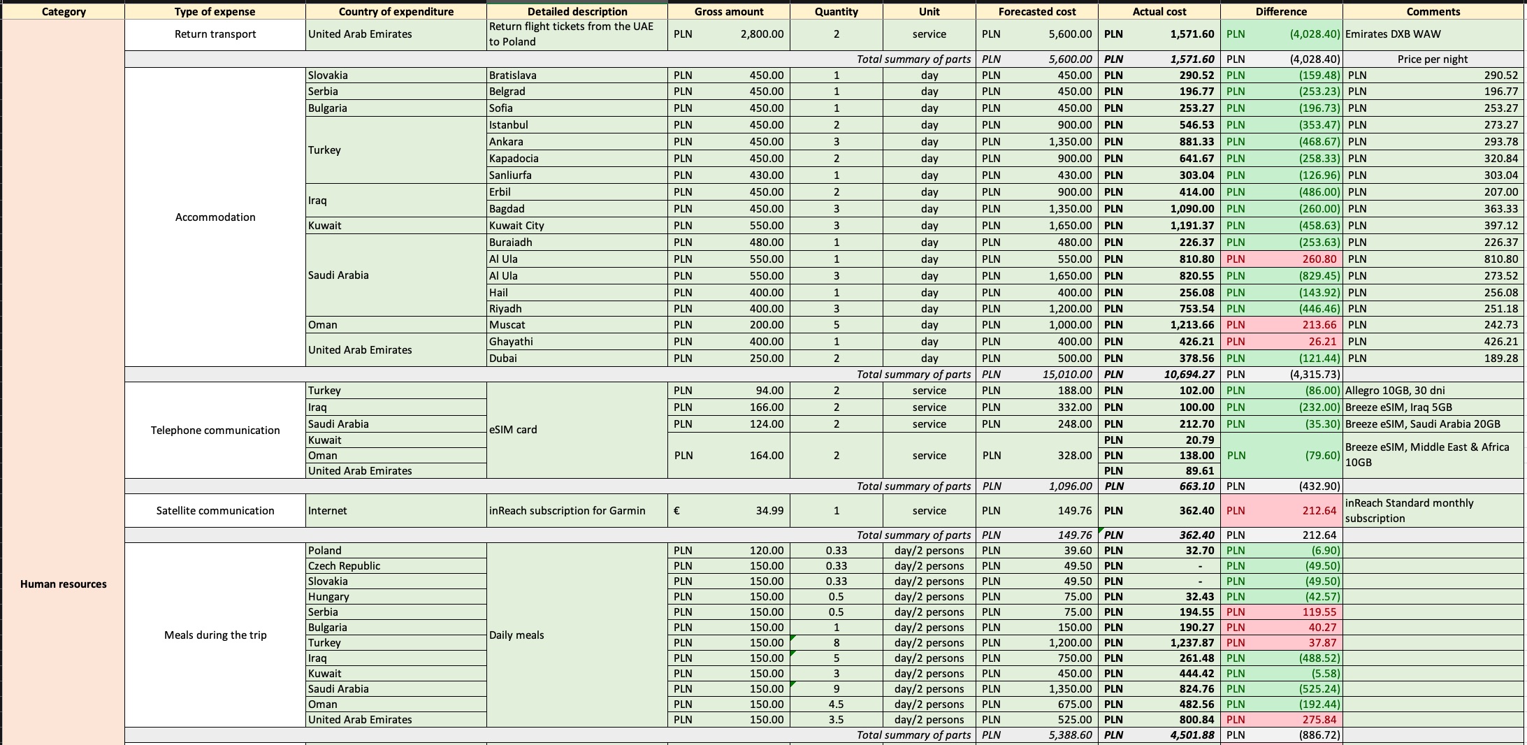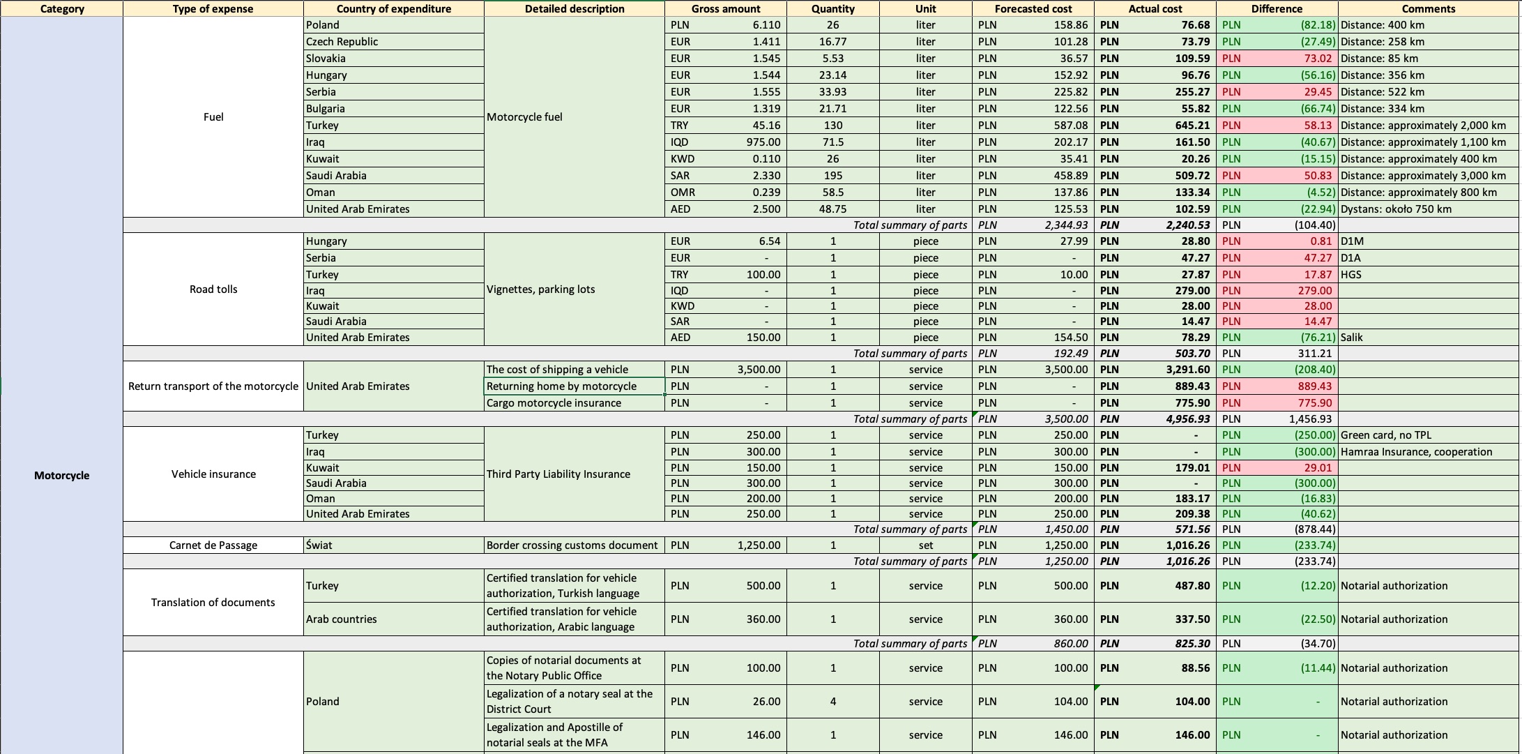 Część wydatków była prosta do przewidzenia, bo są po prostu sztywne: urzędowe opłaty, dokumenty, część ubezpieczeń. Ale były też koszty, których nie dało się dobrze wywróżyć z wyprzedzeniem – np. opłaty na granicy w Iraku przy wjeździe i wyjeździe. Takie rzeczy w excelu lądowały jako pozycje, które pojawiły się dopiero w trakcie i dlatego u nas są zaznaczone na czerwono.